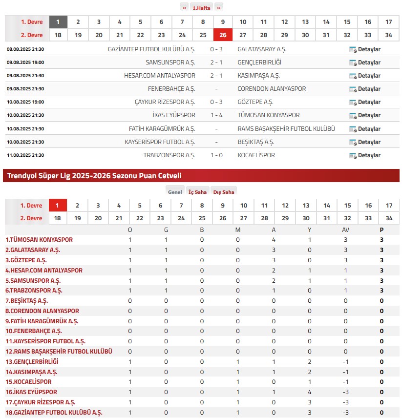 Trendyol Süper Lig İlk Hafta Maçları ve Sonunda Oluşan Puan Durumu