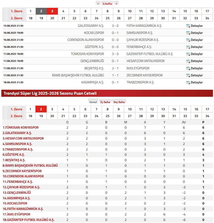 Trendyol Süper Lig İkinci Hafta Maçları ve Sonunda Oluşan Puan Durumu