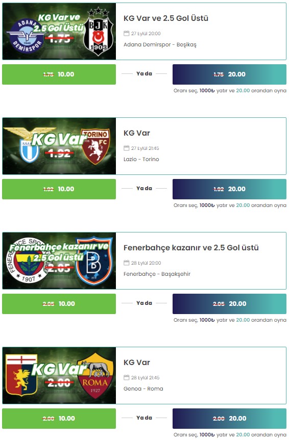 Bets10’da eğlence var, güven var, kat kat kazanç var! Bets10 bahis ve casino markası üyeleri için her geçen gün daha çok kazandıran heyecanı artıran harika kampanyalar yapıyor. Örneğin Bets10 haftanın 10’ları kampanyası geçtiğimiz sene sadece 10 oran veriyordu ama bu sezonun başlangıcıyla birlikte bu kampanyada 20 katı kazanç da sağlanabiliyor. Bahis sever Bets10 üyeleri 20 katı heyecan ve kazanç sağlıyor. İşte 27-28 Eylül tarihli özenle seçilen 20 oranlı maçlar;