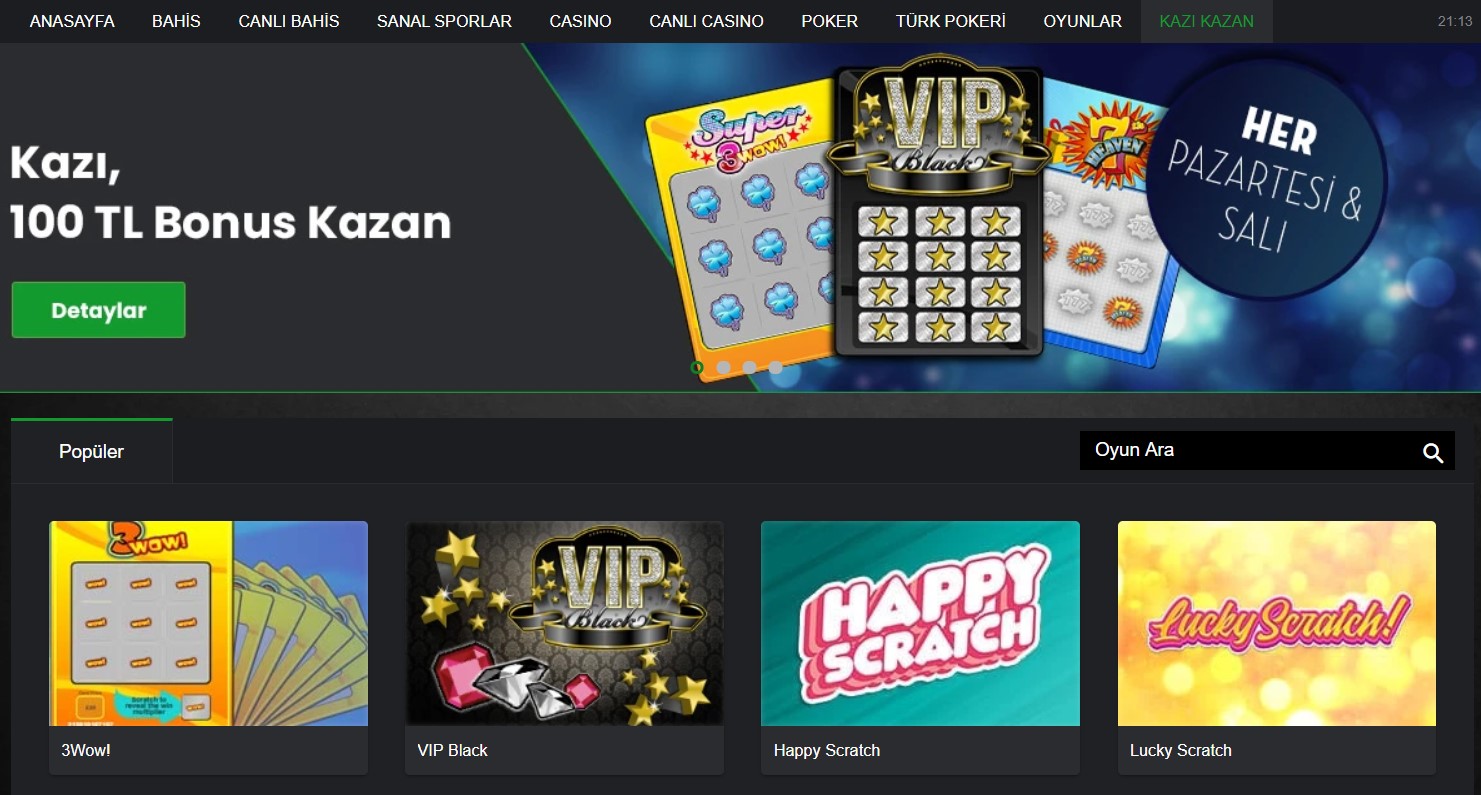 Kazı kazan ile kazanma keyfi farklı oyun çeşitliliğiyle Bets10 şans oyunları sitesinde. Hem masa üstü bilgisayarlarda, hem de tüm mobil cihazlarınızda. Artık zamanınızı sokaklarda kazı kazan kartları arayarak geçirmenize gerek yok, Bets10 ile beraber kazı kazan her an cebinizde. Klasik, spor, fantezi ve casino kazı kazan kartlarından bir tanesini seçin, 2 ile 2.000.000 TL arasında değişen ödülleri kazanın, ne kadar çok kazı kazan kartı o kadar çok şans.