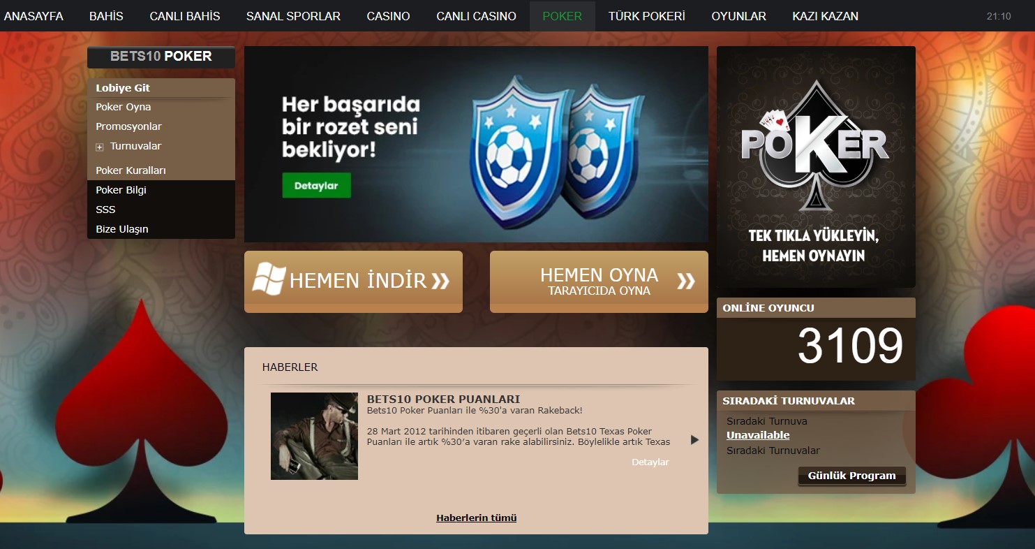 Bets10, poker oyununu kullanıcı dostu bir ara yüze sahip Türkçe dili ile de sunmaktadır. Poker penceresine gelerek menüde yer alan Poker Oyna seçeneğini tıklayarak bilgisayarınıza yükleyebilir, turnuvalar bölümüne giderek tüm ödüller hakkında bilgi alabilir, istediğiniz turnuvaya anında katılabilirsiniz.